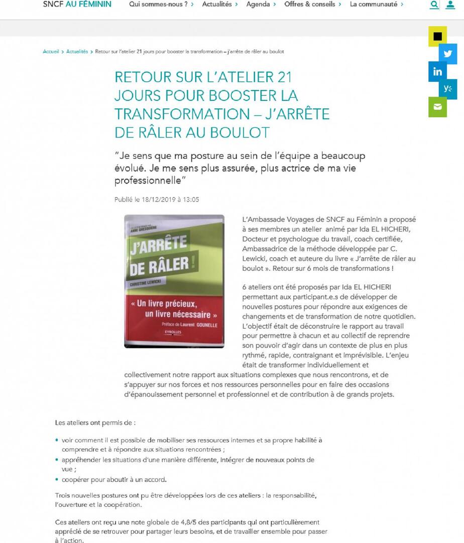 - A l’aide de la méthode de C. Lewicki coach et auteure du livre «J’arrête de râler au boulot», co-écrit avec la DRH de Groupama, Emmanuelle Nave, nous invitons vos équipes à choisir de faire de leur activité professionnelle un terrain de jeu stimulant et à construire un nouveau rapport au travail. Chacun et le collectif est invité à développer sa propre responsabilité : sa propre habilité à répondre aux situations qui se présentent dans un monde imprévisible et complexe. L’enjeu est de transformer individuellement et collectivement la contribution apportée et de faire du travail une source et un lieu d’épanouissement et de réalisation personnels au service de ce que l’entreprise a à offrir à ses clients : du bien-être de tous et de la performance.