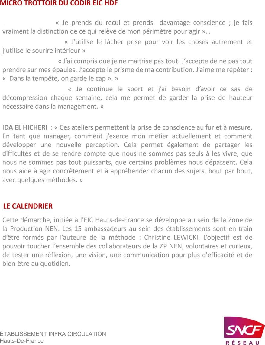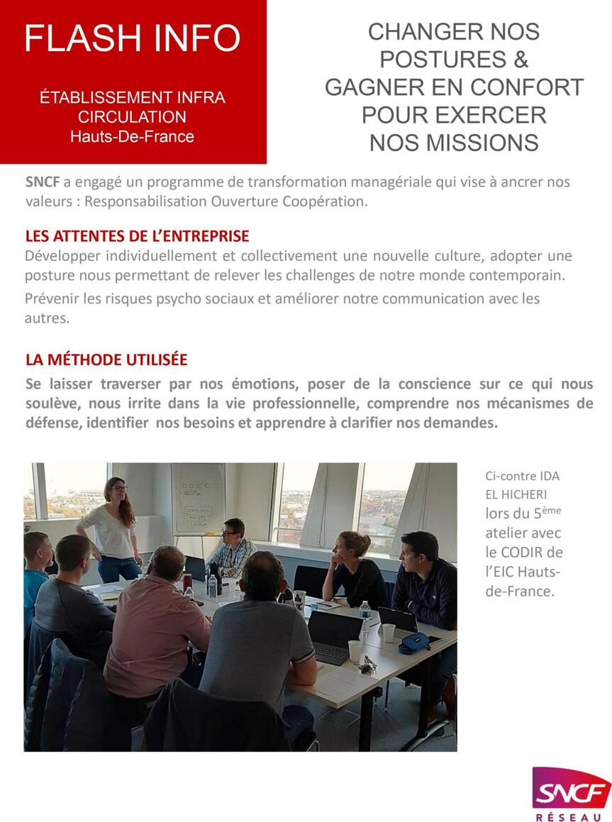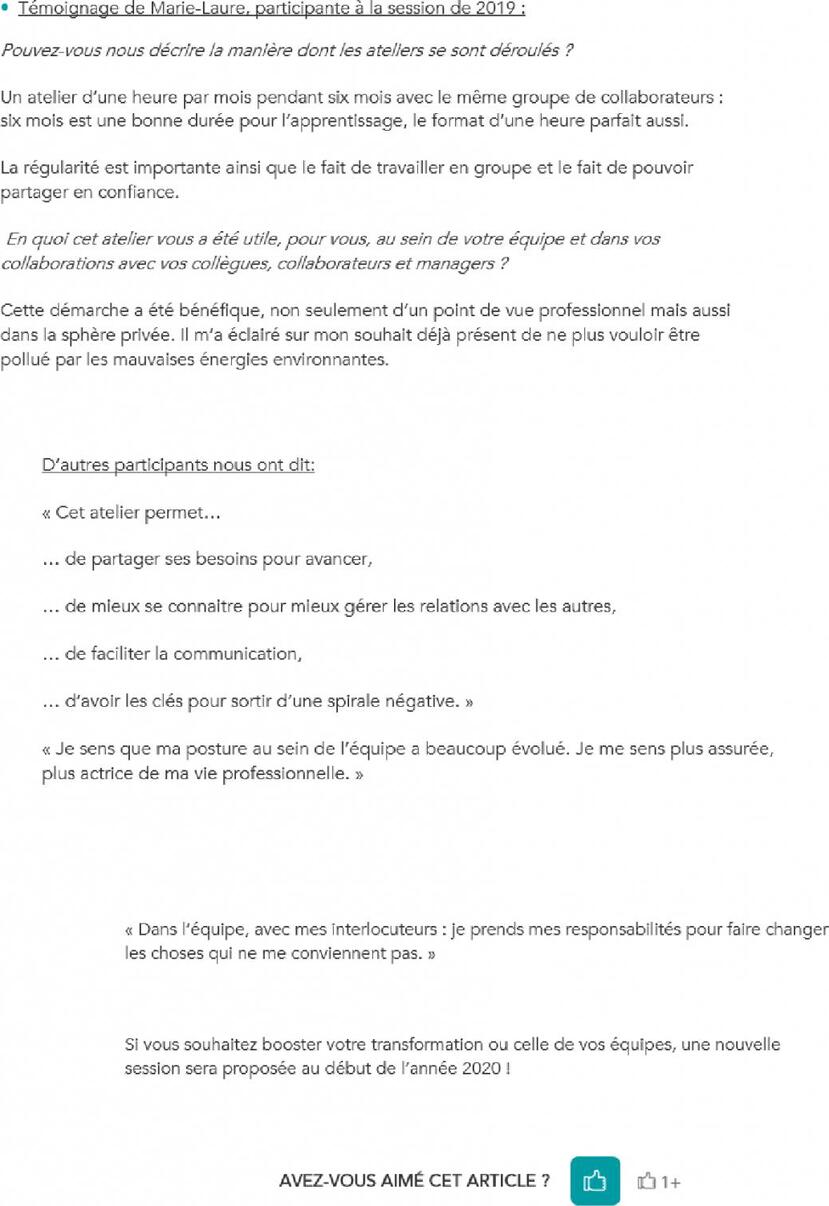 - Il s’agit de 6 ateliers regroupant collaborateurs et managers volontaires pour gagner en responsabilisation, en autonomie et aussi développer les coopérations face à la complexité et aux aléas du quotidien dans un monde du travail de plus en plus concurrentiel, rapide et exigent.